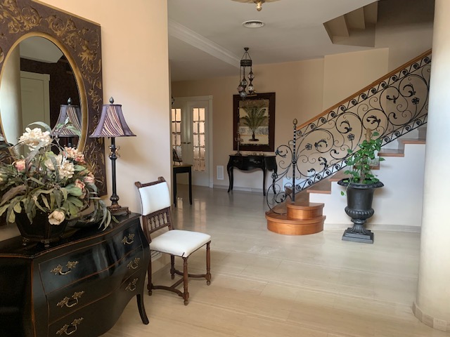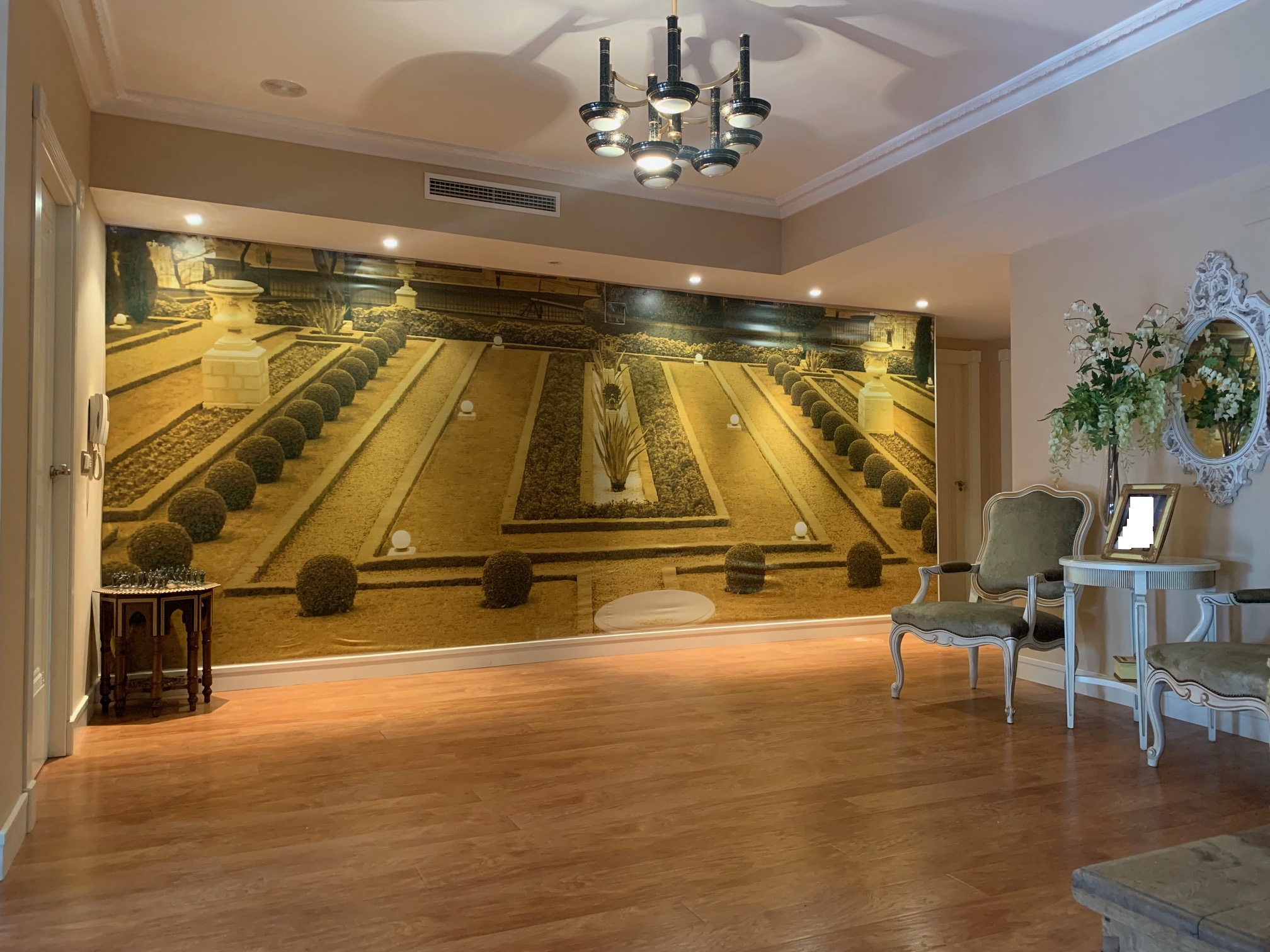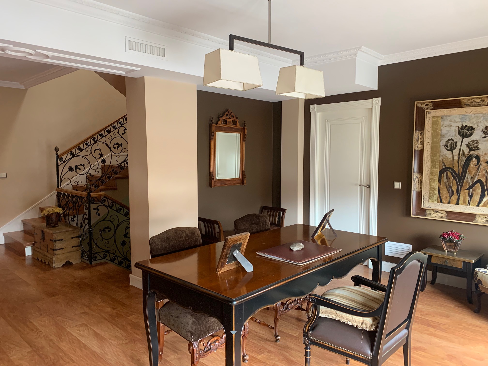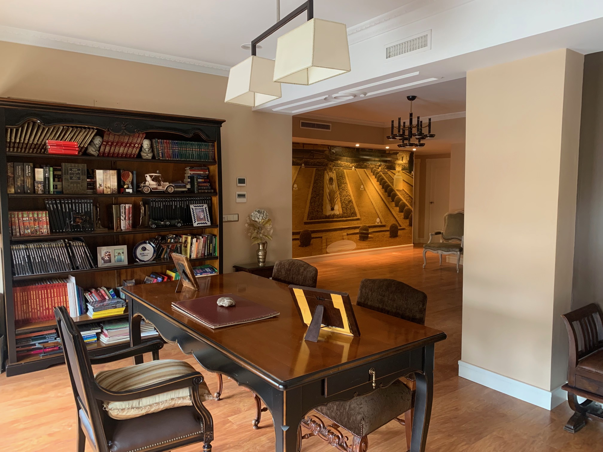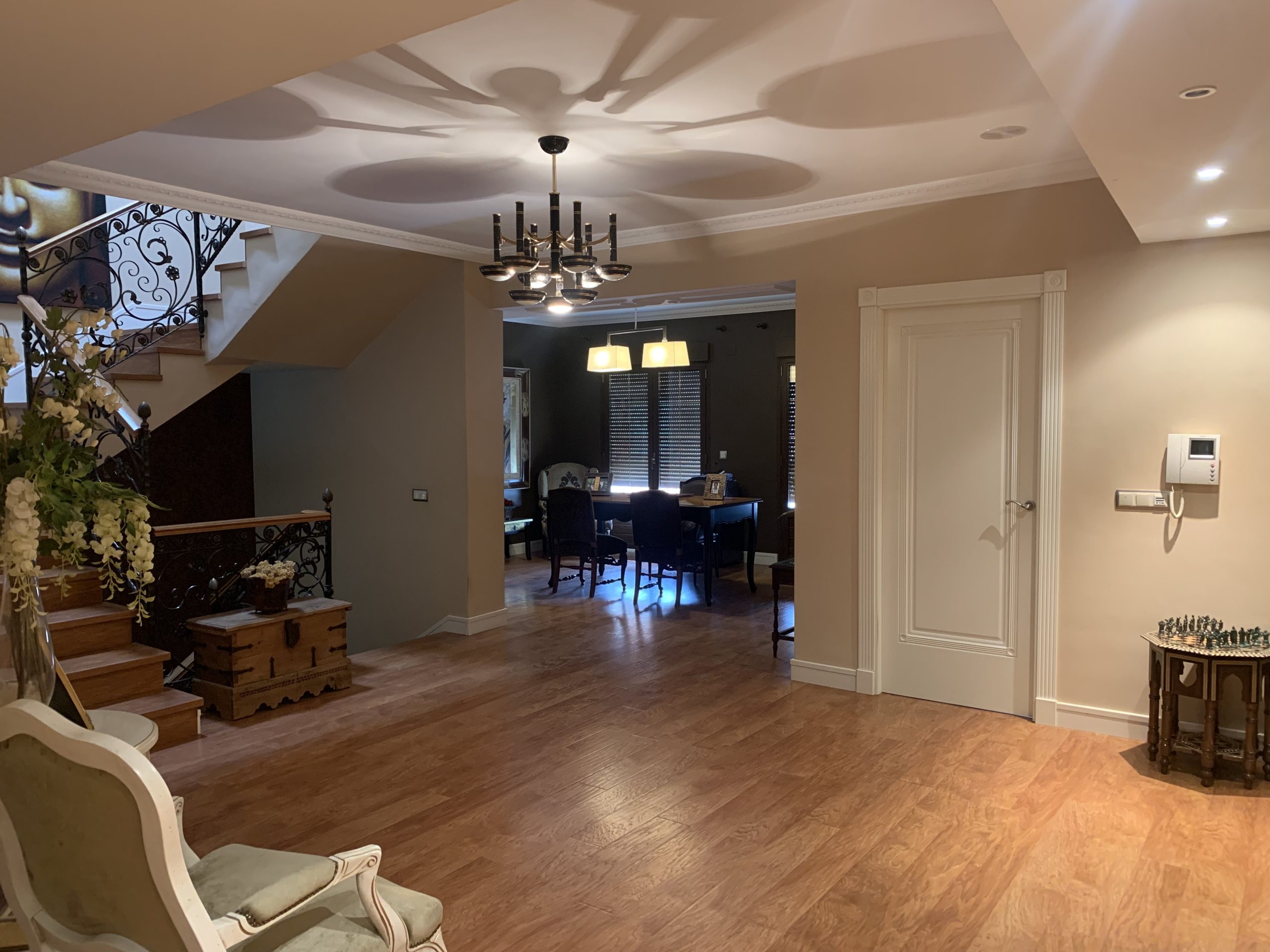 En la primera planta encontramos un  amplísimo hall  con vinilo de los jardines de Versalles, espacio abierto con despacho biblioteca, 3 habitaciones, de las cuales una de ellas dispone de vestidor y baño con ducha, el otro baño tiene bañera con mamparas y azulejos decorativos, y a parte hay trastero y lavadero con ventanas hacia el patio. Suelo de tarima igual que la de la escalera. Todas las ventanas con balcones y ventanas hasta el suelo, y con persianas motorizadas.
