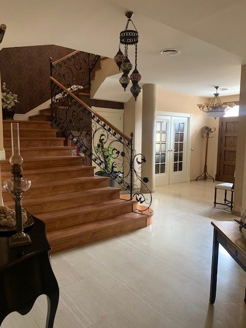En planta baja encontramos un magnífico vestíbulo que nos muestra la primera vista de esta preciosidad de vivienda, cuyo suelo es del material travertino, color beige. Todas las puertas de esta planta son de color blanco roto con herrajes y manivelas color plateado. De frente a mano derecha podemos observar la amplia escalera con forma, sus escalones forrados con tarima color madera y baranda de forja, diseño exclusivo. Encontramos a su paso un aseo de cortesía con azulejos de diseño, y mueble de decoración con encimera de mármol travertino. Además de la habitación de matrimonio con vestidor y baño con plato de ducha (azulejo de mármol), un salón con ventana de decoración, y puertas dobles con cristaleras “habitación + salón con ventanas hacia la calle”. Después tendríamos una amplia cocina con puertas dobles y con salida hacia el patio, puertas dobles con cristales, por las cuales entra toda la luz, las paredes de la cocina tienen puesto un zócalo alto, color madera beige (techos revoltones), y lo mejor de todo: una estupenda chimenea forrada con columnas de piedra en color beige y cristal para cerrarla, arriba poyo de madera. Los muebles de cocina son de color madera roble, y suelo gres. El patio alicatado, paredes y suelo gres (anti grietas frío y calor), además de una piscina con capota para cubrir en invierno.